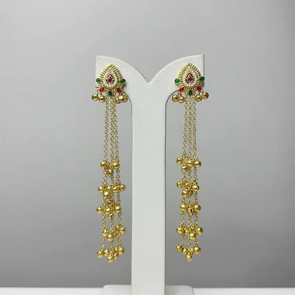 These Kashmiri gold earrings bring a royal charm without the heavy price tag, making them a perfect budget-friendly alternative for traditional occasions. The pear-shaped top features fine detailing with rich red, green, and white accents that add a festive touch. Delicate centre motifs and smooth glossy drops enhance its premium artificial gold earrings finish. The multi-layered gold-toned ghungroo chains sway beautifully with every movement, creating a striking Jhumka earrings artificial statement. And yes, this version is not made of brass, ensuring lightweight comfort for weddings, sangeet nights, and festive celebrations.