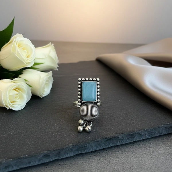 Add some elegance to your jewelry collection with this Oxidised German Silver Ring featuring a serene blue Monalisa stone in a rectangular frame. The beaded edging and ribbed silver finish are enhanced with tiny dangling beads, offering just the right amount of tradition and style. Crafted with excellent German silver, this oxidised ring is light, durable, and comfortable to wear for extended periods. The ring size that adjusts is a perfect fit for each finger, making it an ethnic and fusion wardrobe staple both.