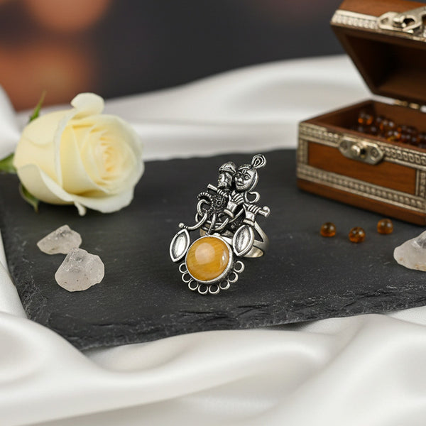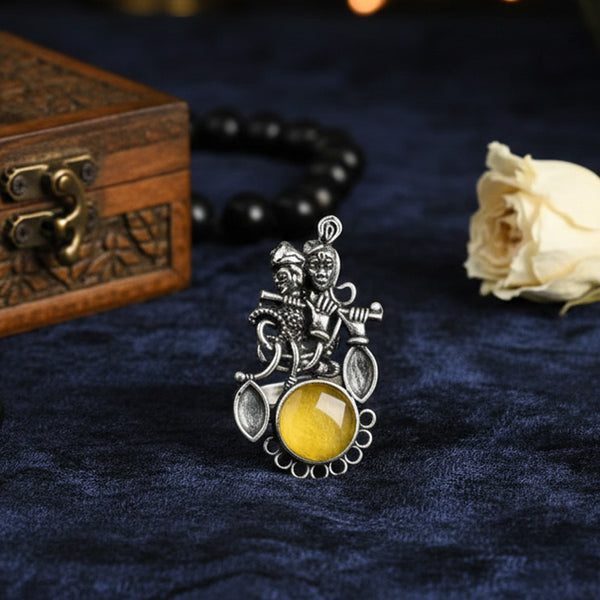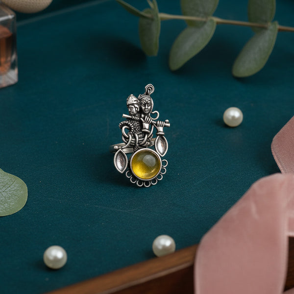 Add your ethnic beauty with this Oxidised German Silver Stylish Antique Ring. Made from a beautiful pattern according to old work, the jewel is adorned with genuine looking Monalisa stones that make a splash of serene beauty. The ring is bendable to wear comfortably well, and the ring studs on the finger for an eye-catching appearance. Perfect match with an oxidised silver bangle or stone bangle, it blends classic elegance with modern elegance. A wedding accessory, gift accessory, or must-have celebratory accessory, this oxidised ring is your go-to for timeless style.