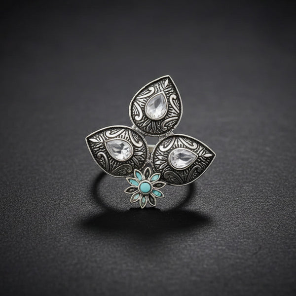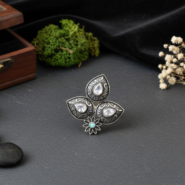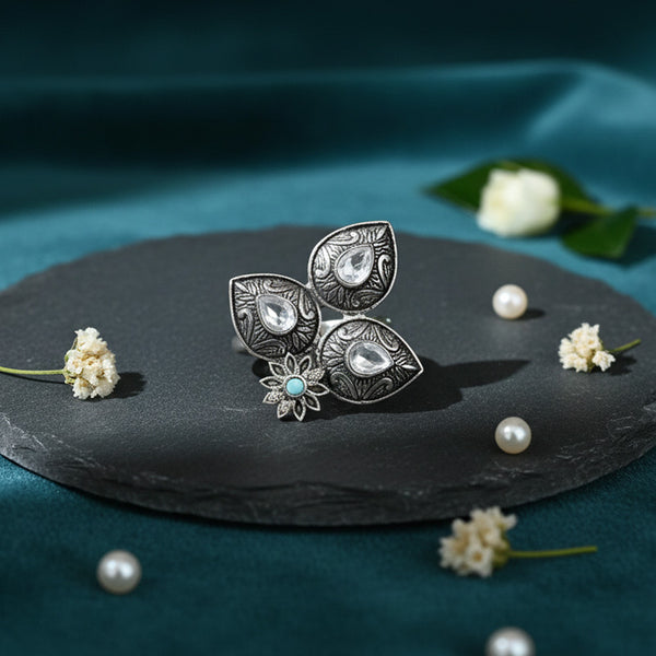 This beautiful Oxidised German Silver Ring boasts Monalisa stones on an idyllic floral and leaf pattern, projecting a flawless combination of form and heritage. Made from premium German silver, the oxidised finish bestows on it an ageless vintage appearance. Adjustable in ring size, it provides a great fit for all. This stunning silver women's ring is perfect for creating a statement finish for holidays as well as day-to-day fashion, so it's an essential oxidised ring to add to your jewellery collection.