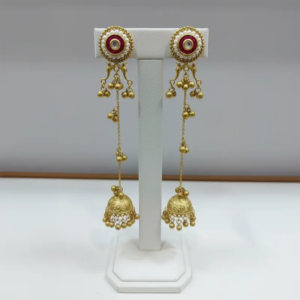 These red gold plated Kashmiri jhumka earrings will really make your festive look more special. The red studs on top of these are very beautiful, finely beaded work has been done all around, which gives a royal feel. At the bottom are golden chains that are attached to the earrings, and on those earrings are small knobs with carvings that give a slight chime while walking. It looks very cute. This combination of red and gold will look great with any saree, lehenga or anarkali. Be it a wedding, festival or any traditional function, these earrings will add a royal touch to your look. Their long design enhances the face, which makes the whole festive look very elegant. And best of all, they're super lightweight and look great. That’s why you can wear it all day, there will be no heaviness.